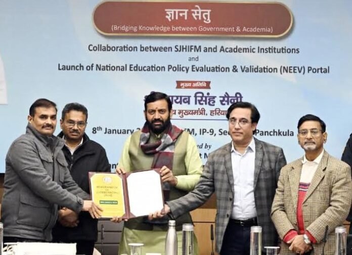 The Chief Minister was speaking to mediapersons after an MoU exchange programme held in Panchkula. He explained that the NEeV Portal has been designed to ensure objective, transparent and continuous evaluation of every provision of the National Education Policy 2020. The portal uses real-time data, performance indicators and predictive analysis to monitor the education system on an ongoing basis. This makes it possible to clearly identify which institutions are progressing in line with the policy and where corrective measures are required.