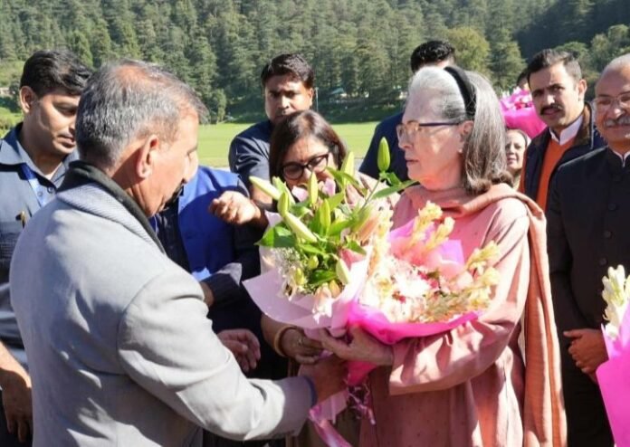 Sonia Gandhi reached the hill state on a brief visit to review party affairs and meet senior leaders and workers. The Chief Minister personally received her with flowers and exchanged greetings at the state guest house, marking a cordial beginning to her visit.